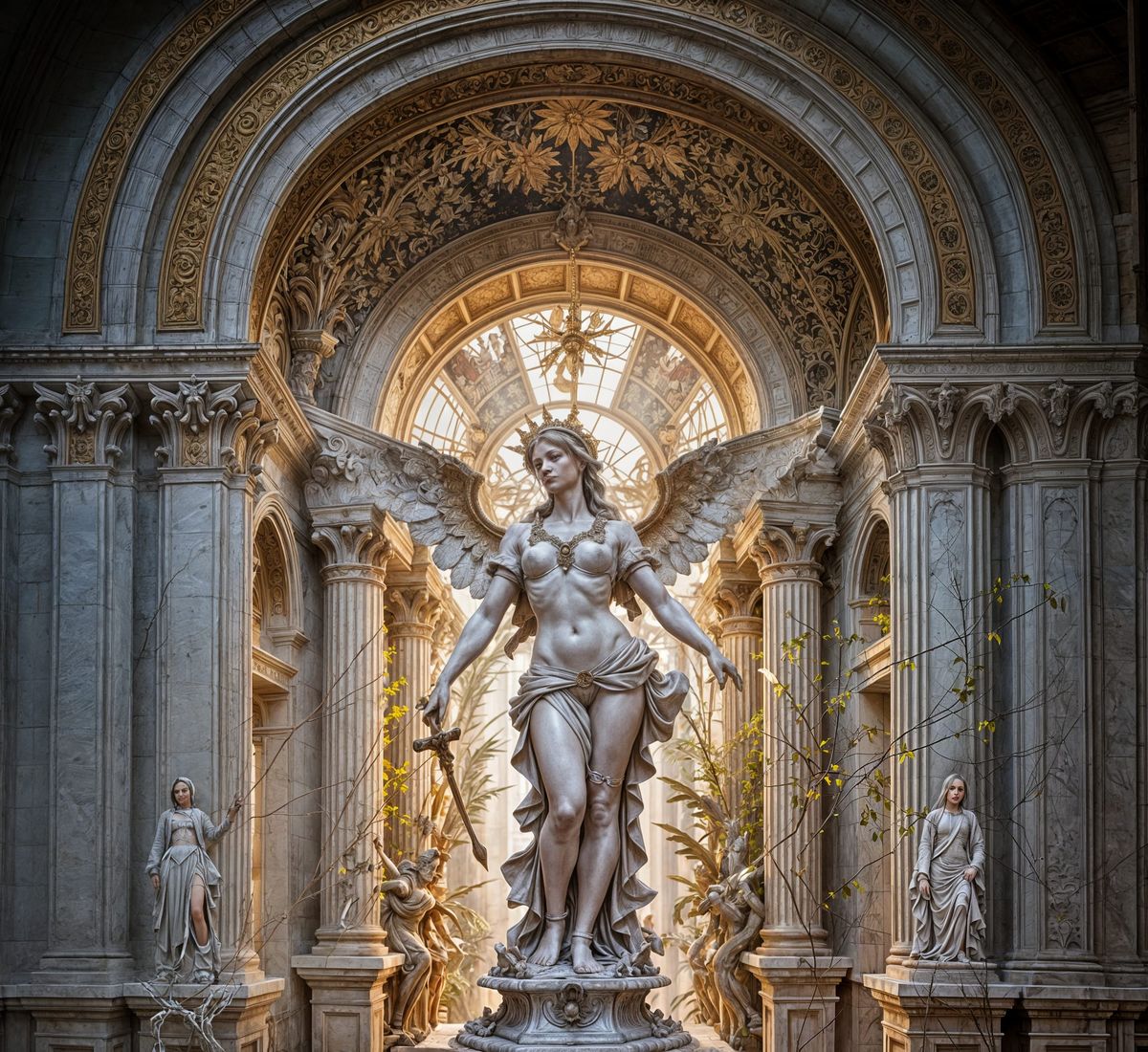 A panoramic image showing Winged Victory in a Neo-Renaissance arcade. Soft light enhances the marble and gold statue. This watercolour painting has elements of ethereal stylization.