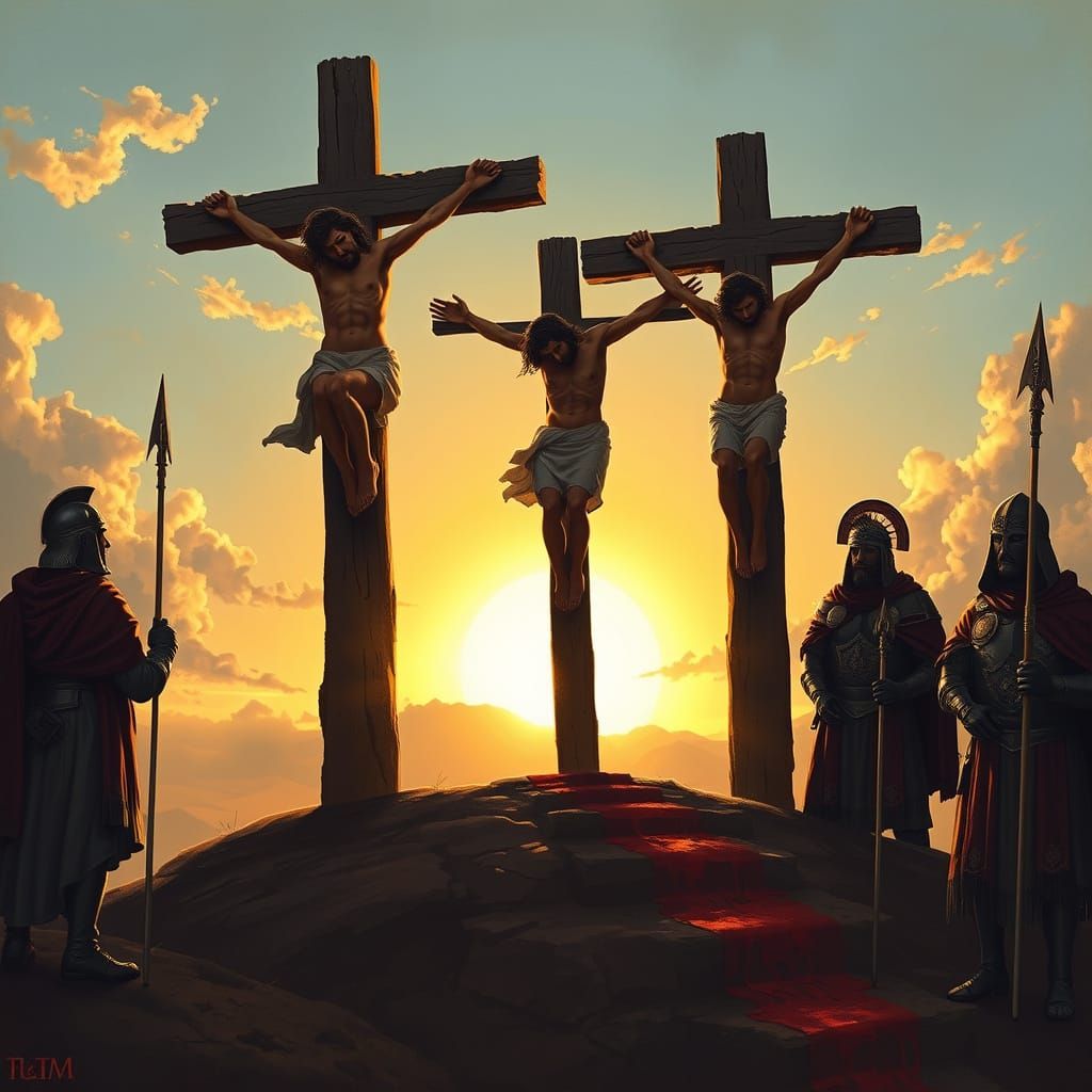 This image depicts a poignant scene of three crosses on Golgotha's hill, set against a warm golden sunrise, with blood flowing down the hill and Roman soldiers standing guard, evoking a sense of reverence and contemplation in a mix of chiaroscuro and tenebrism.