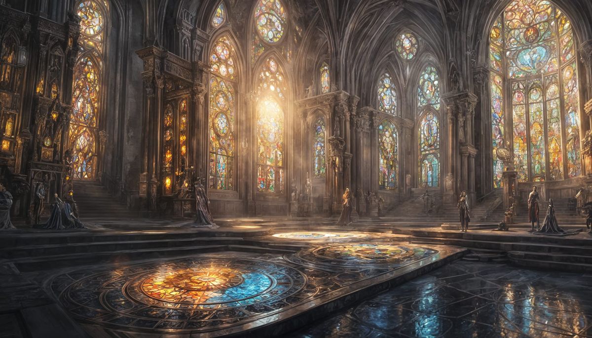 This image depicts a futuristic female robot adorned in a gown resembling stained glass cathedral windows, with glowing panels lit by a beam of sunlight.