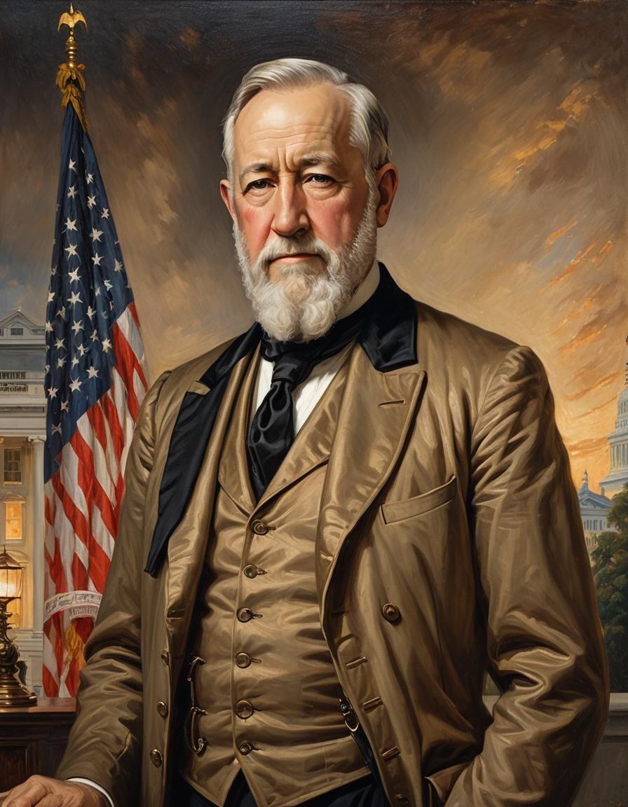 A dignified oil painting of Benjamin Harrison in front of the US flag and White House. This portrait captures the essence of 18th-century fine art with warm colors and subtle chiaroscuro.