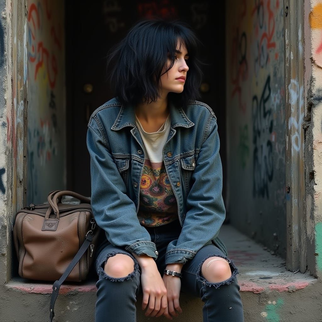 A gritty image of a young Spanish woman with black hair sitting on a stoop. The scene evokes an urban decay aesthetic with expressive brushstrokes and moody lighting.