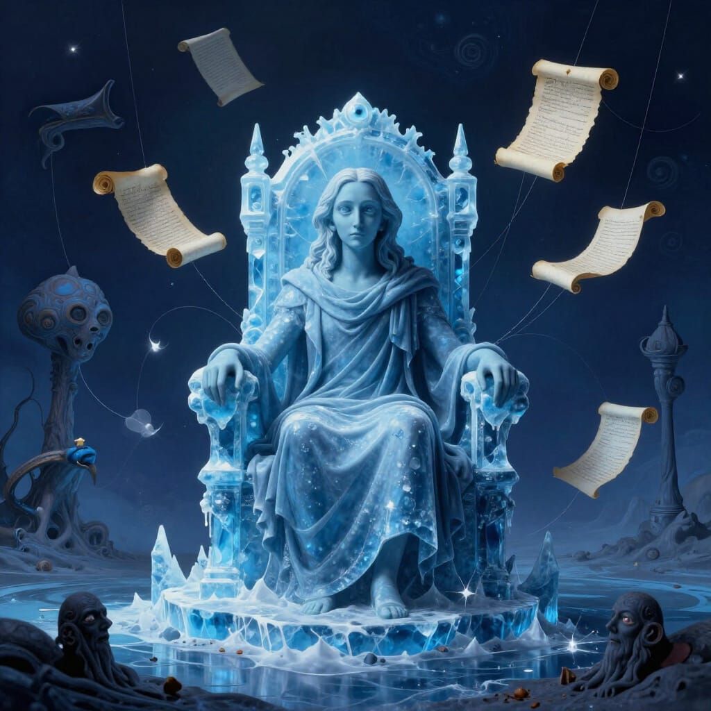 This image depicts a spectral philosopher in a surreal dreamscape, seated on a melting ice throne. The art style is inspired by surrealist masters, featuring vivid blues and deep indigos, with elements of dark fantasy and enigmatic composition.