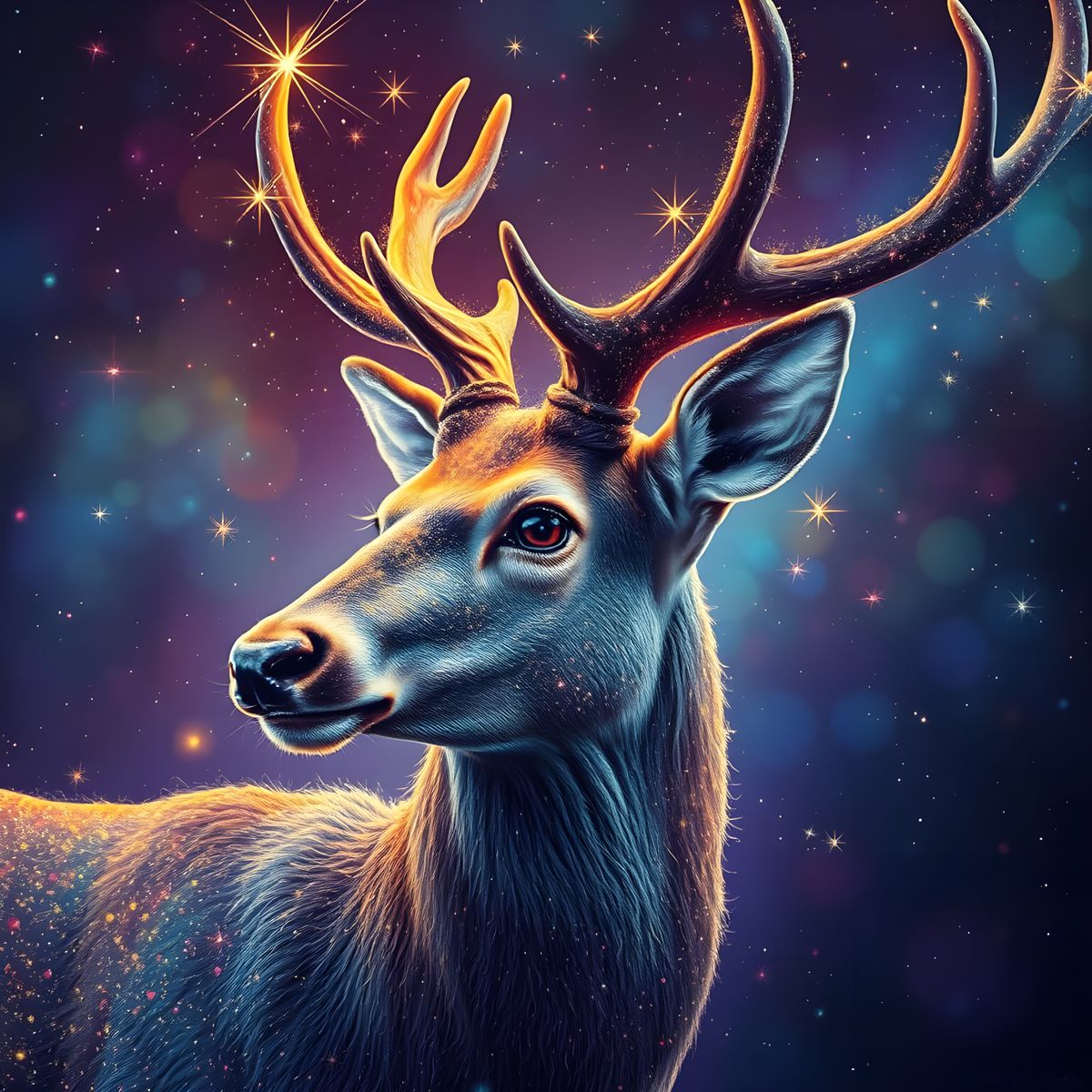This image shows a stardust deer apparition in a dream world. The deer features shimmering cosmic dust and starlight ablaze on its antlers, depicted as hyperrealistic splash art.