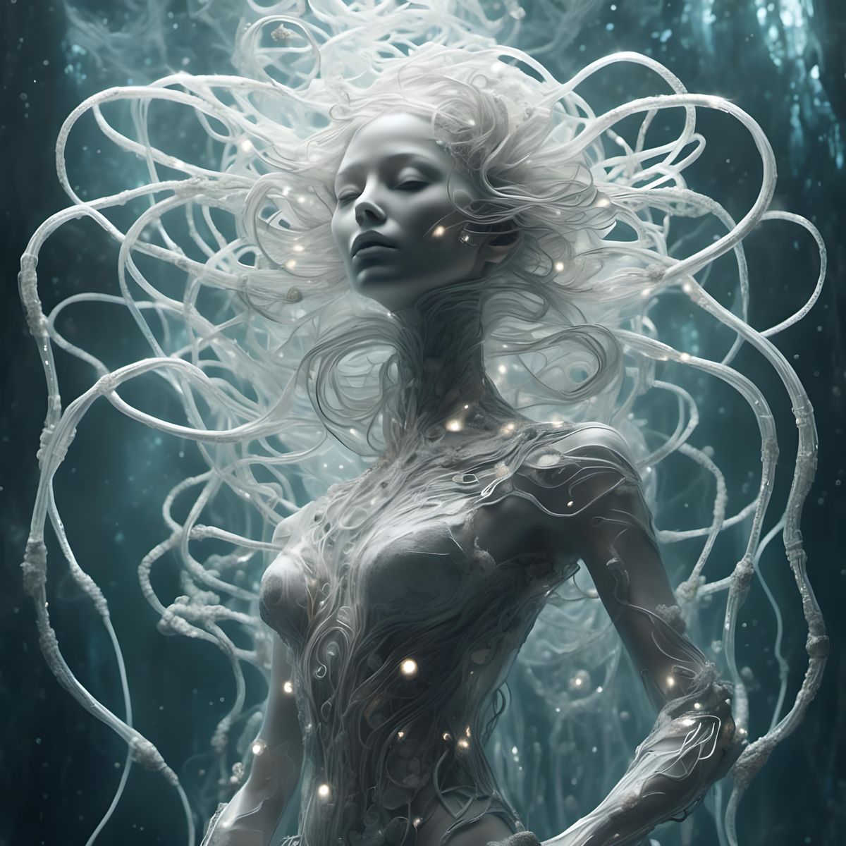 A striking picture of a pale, creature-like entity encased in transparent plastic, with luminous cables visible beneath. The figure is set in a dark underwater environment, with dynamic lighting and a minimalist aesthetic.