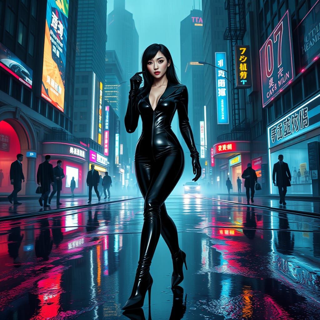 This image depicts a striking Chinese woman in a cyberpunk city, clad in a black latex suit, walking confidently through the rain-soaked streets. Neon lights and digital advertisements create a vibrant, yet dystopian atmosphere, with towering skyscrapers looming above.