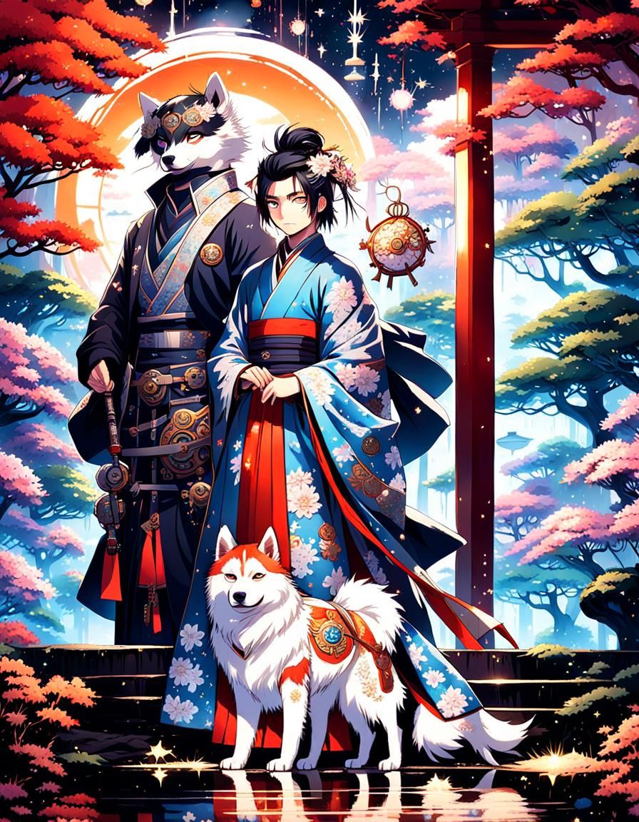 This image shows a handsome clockwork samurai with blue eyes and a Shiba Inu in a bioluminescent forest. The artwork features intricate steampunk and anime elements, with Victorian and Goth influences.