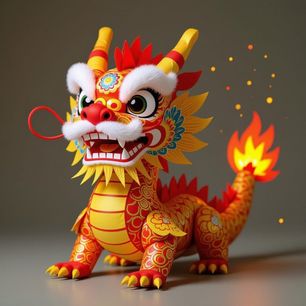 A papier-mâché dragon doll with cartoonish features in red and gold. The design blends playful colors and intricate patterns, reminiscent of Chinese New Year celebrations, with glowing confetti.