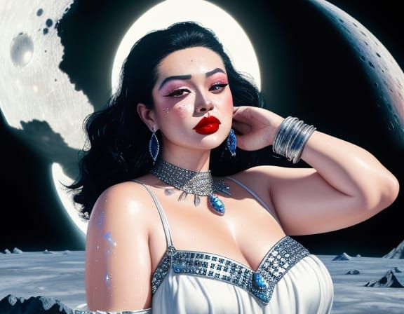 A photorealistic medium shot of a plus-sized halfling barbarian. She wears conservative white clothing with sensual gems and glittering jewels, standing near a lunar crater in soft lighting.
