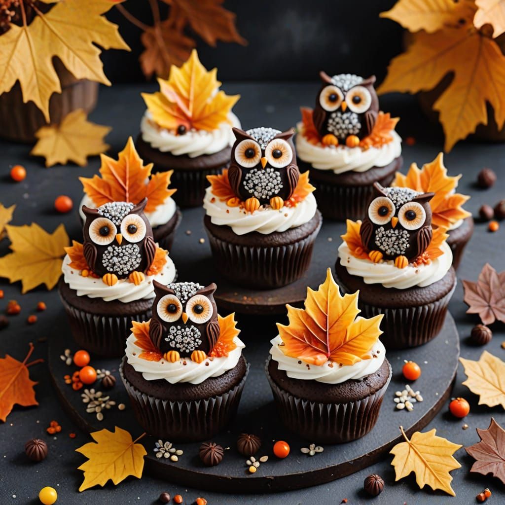 This image features enchanting chocolate cupcakes adorned with autumn-inspired icing, crystals, and owl figures, set against a magical forest backdrop of colorful leaves.