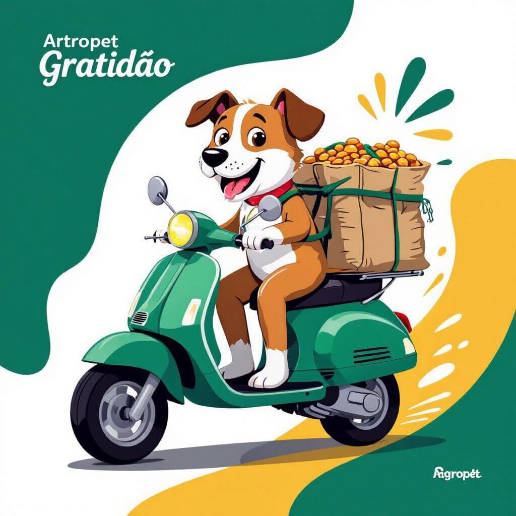 This image features Motocão, a friendly dog mascot, joyfully riding a motorcycle with premium pet food. Vibrant green, yellow, and white colors convey energy and speed in a modern vector style.
