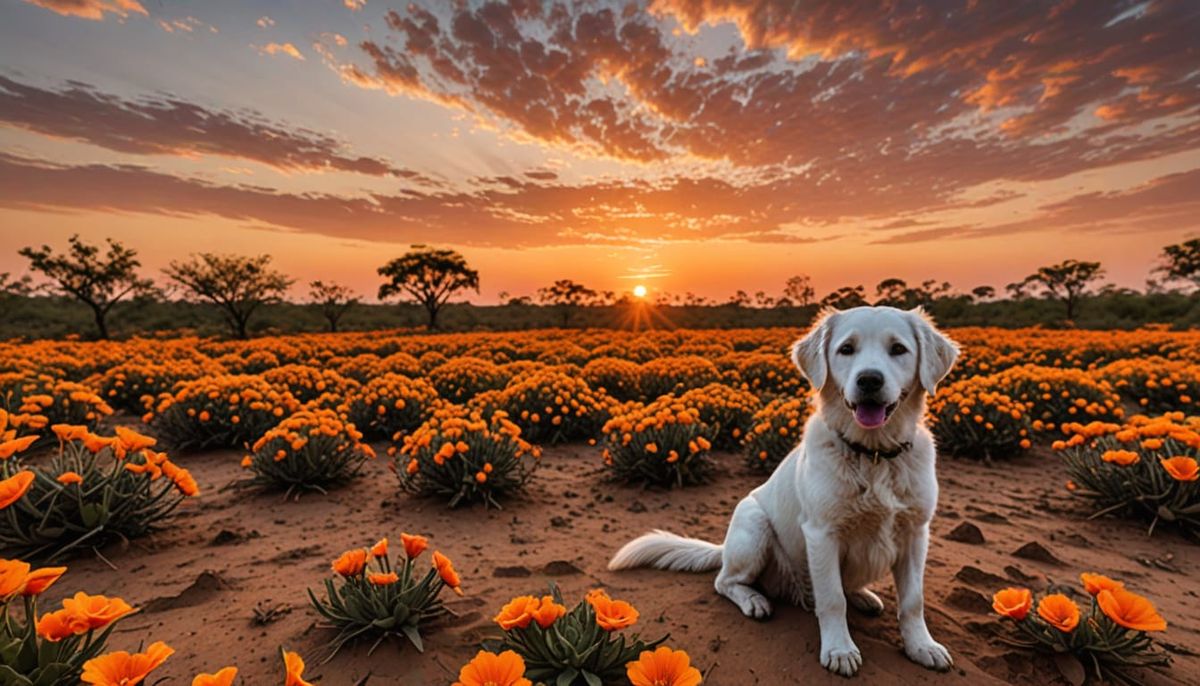 Um cachorrinho alegre descansa em um vibrante oásis no deserto, cercado por campos verdesjantes e flores silvestres espalhadas. O pôr do sol...