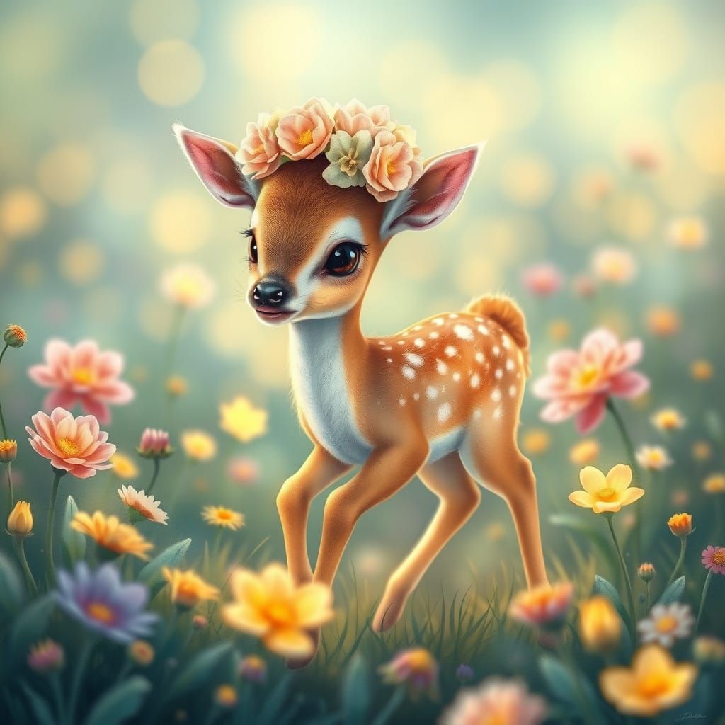 This image features a delicate fawn wearing a crown of glowing flowers, set against a vibrant, glowing meadow with intricate details and a touch of whimsy, reminiscent of Art Nouveau and digital art