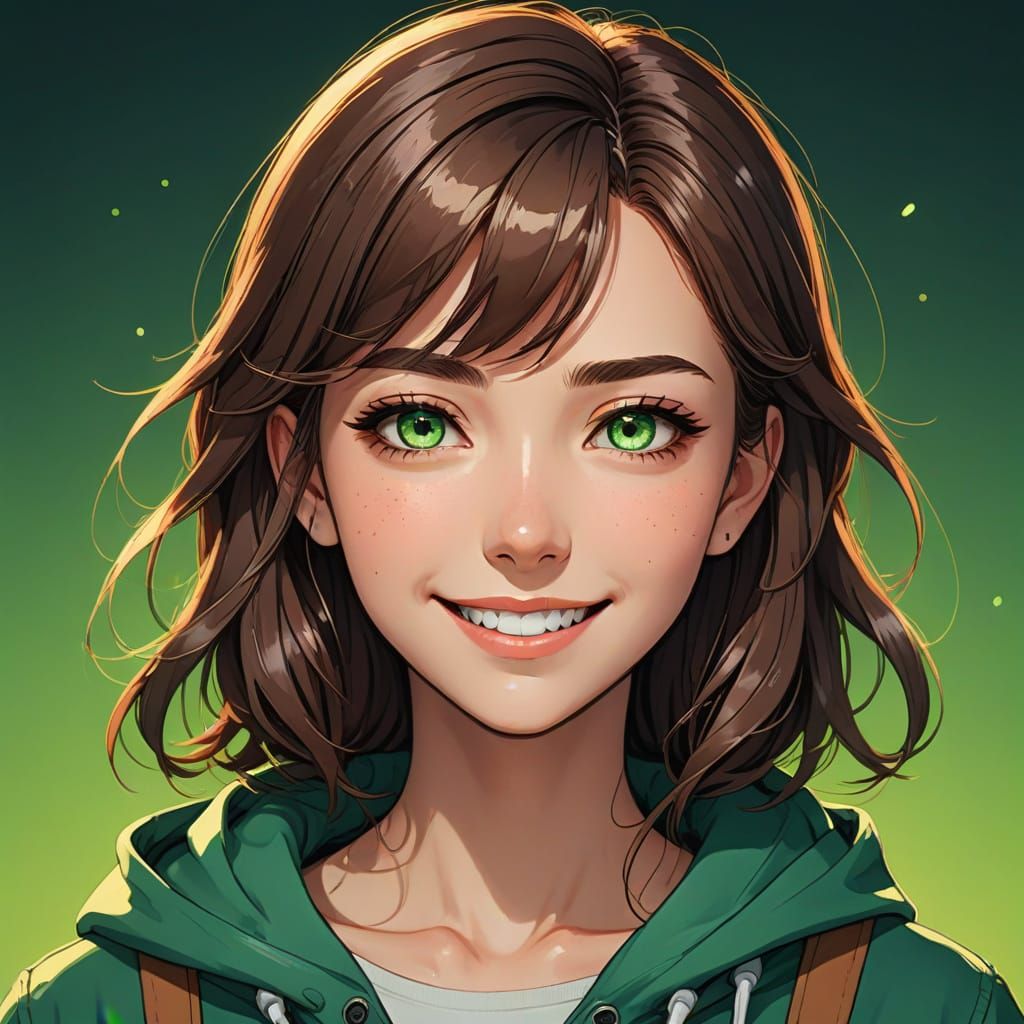 A stunning anime-inspired portrait of a beautiful woman with bright green eyes and brown hair, set against a backdrop of deep colors and bold lines, showcasing a charming and elegant personality.