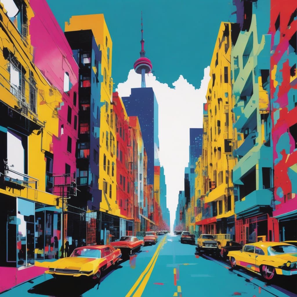 This image features a vibrant, surreal cityscape rendered in a bold, graphic pop art style. It incorporates fragmented commercial visuals, reminiscent of Warhol's iconic aesthetic.