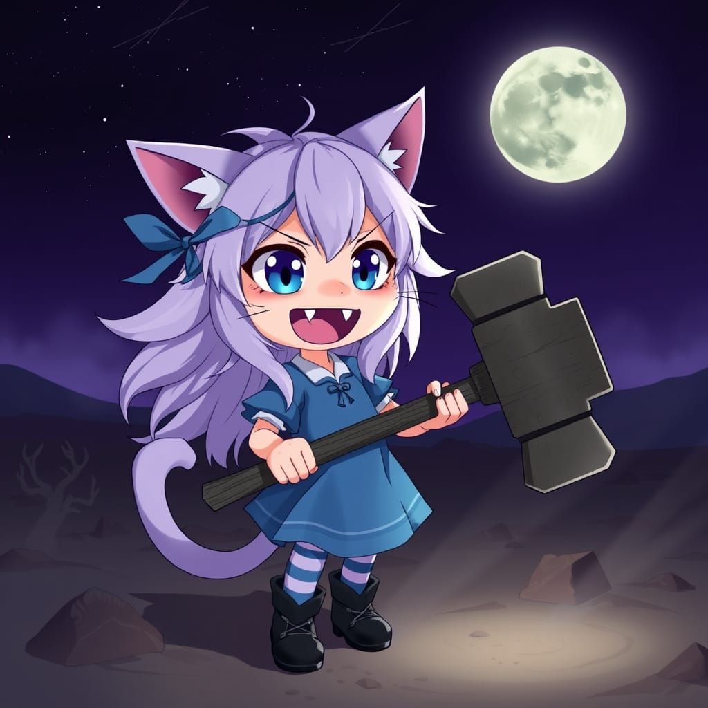 This image shows a cute anime catgirl with a fierce grin, holding a giant hammer in a deserted field at night. She has vibrant lilac hair and cat ears, with a traditional blue dress and leggings. The dark sky is filled with stars and a glowing moon.