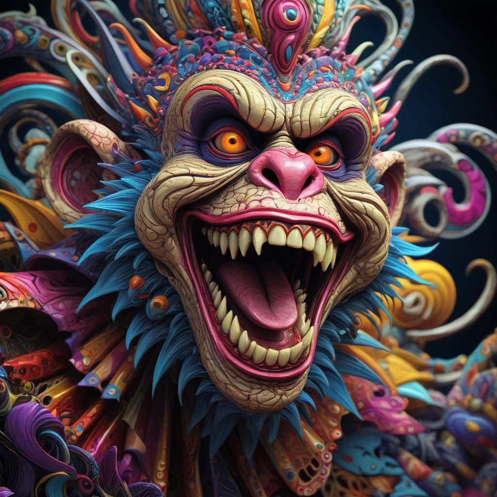 A striking picture of a grinning zombie monkey clown. The digital art features swirling zentangle patterns, fractal geometry, and abstract expressionism in glowing neon colors with high contrast lighting.