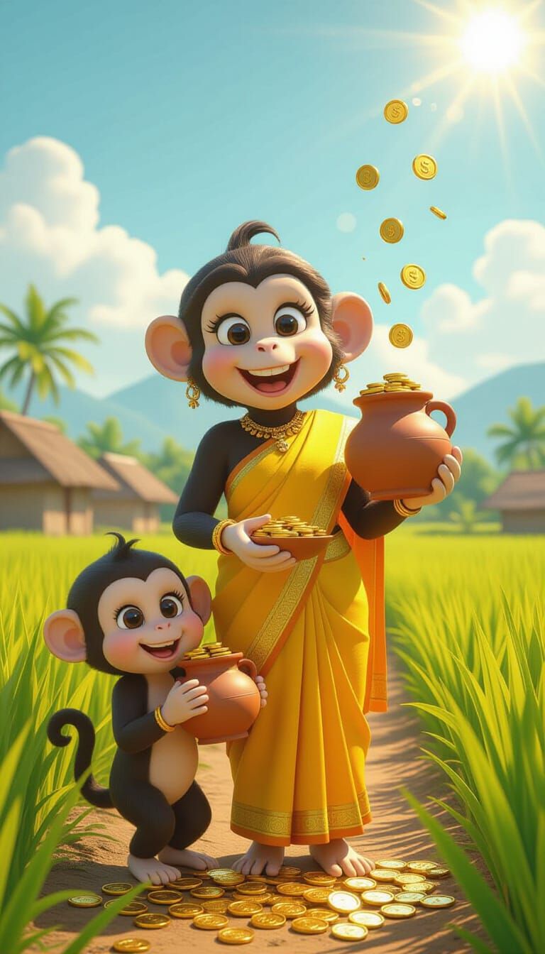 This image shows a mother monkey in a saree and her baby, carrying a pot of gold coins through farmland. The 3D rendering evokes a Pixar or Disney feel with bright, sunny lighting.
