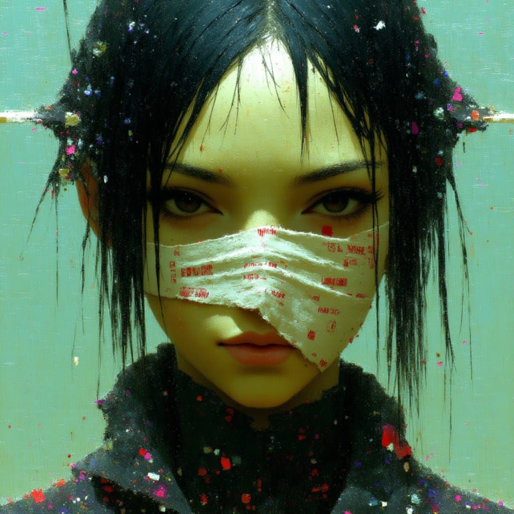 This image features a highly detailed close-up of a young woman's face in a cyberpunk style. She wears a torn bandage over her eyes, with realistic skin textures and chaotic hair. Glitchy holographic elements add to the gritty aesthetic.