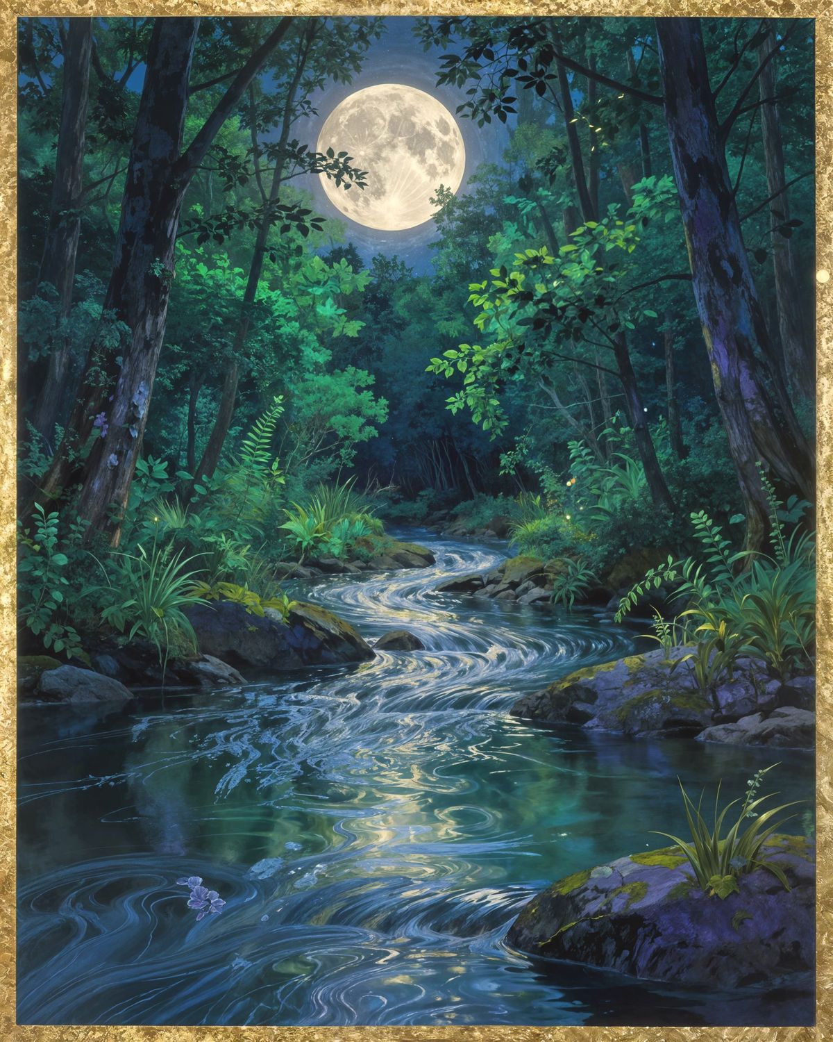 A serene forest river bathed in moonlight, rendered in rich emerald, sapphire, and amethyst hues with metallic accents. Ethereal shadows and highlights create a magical, otherworldly glow on the water and foliage.
