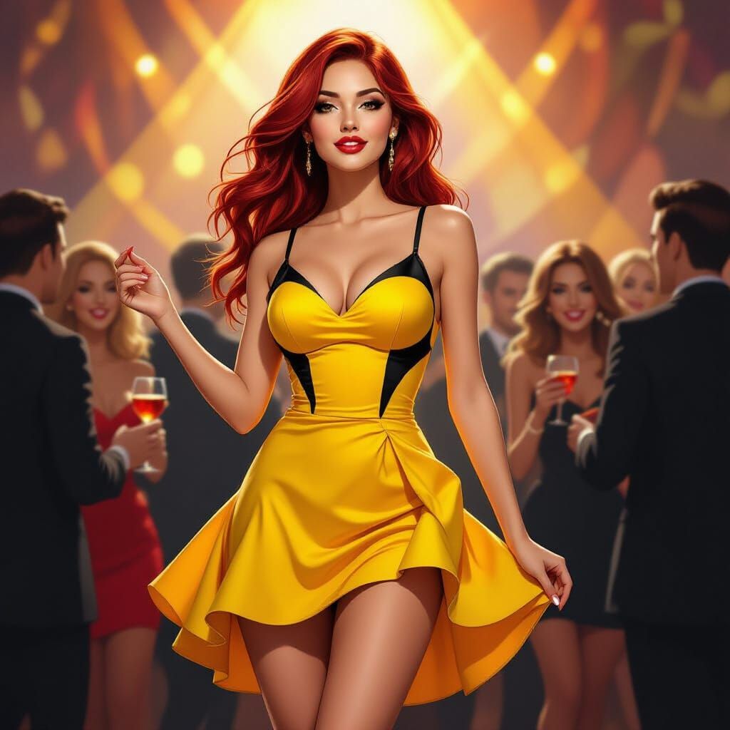 A vibrant image of a young woman in a yellow cocktail dress at a lively party. The artwork features dynamic lighting and vibrant colors, reminiscent of art nouveau styles.