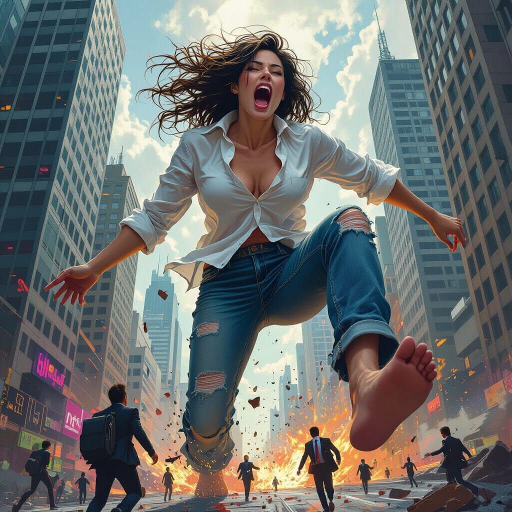A barefoot giantess destroys a city while holding a man. The image showcases a hyperrealistic splash art style, with detailed textures, vibrant colors, dramatic lighting and a dystopian backdrop.