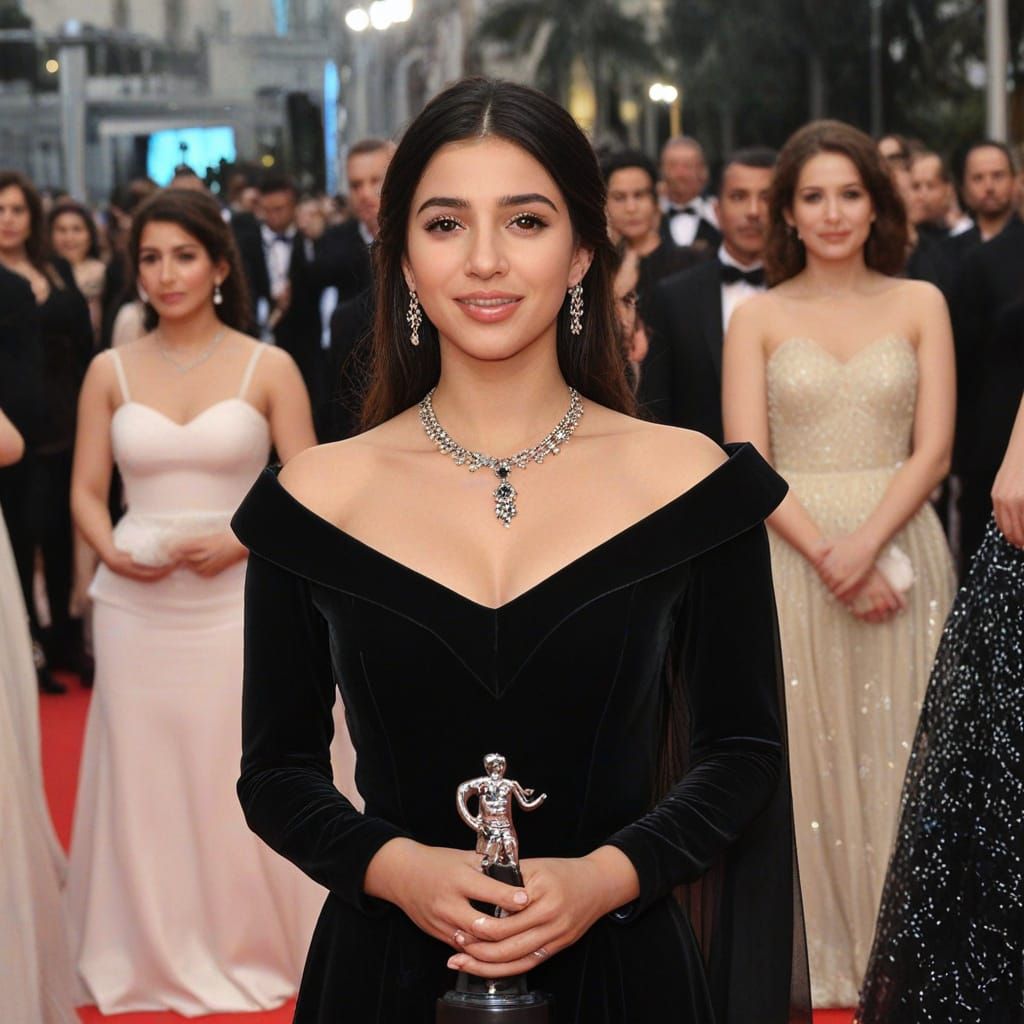 This image shows a stunning woman standing on a red carpet, poised to accept a major award. Created in a contemporary style, with vibrant colors and elegant details.
