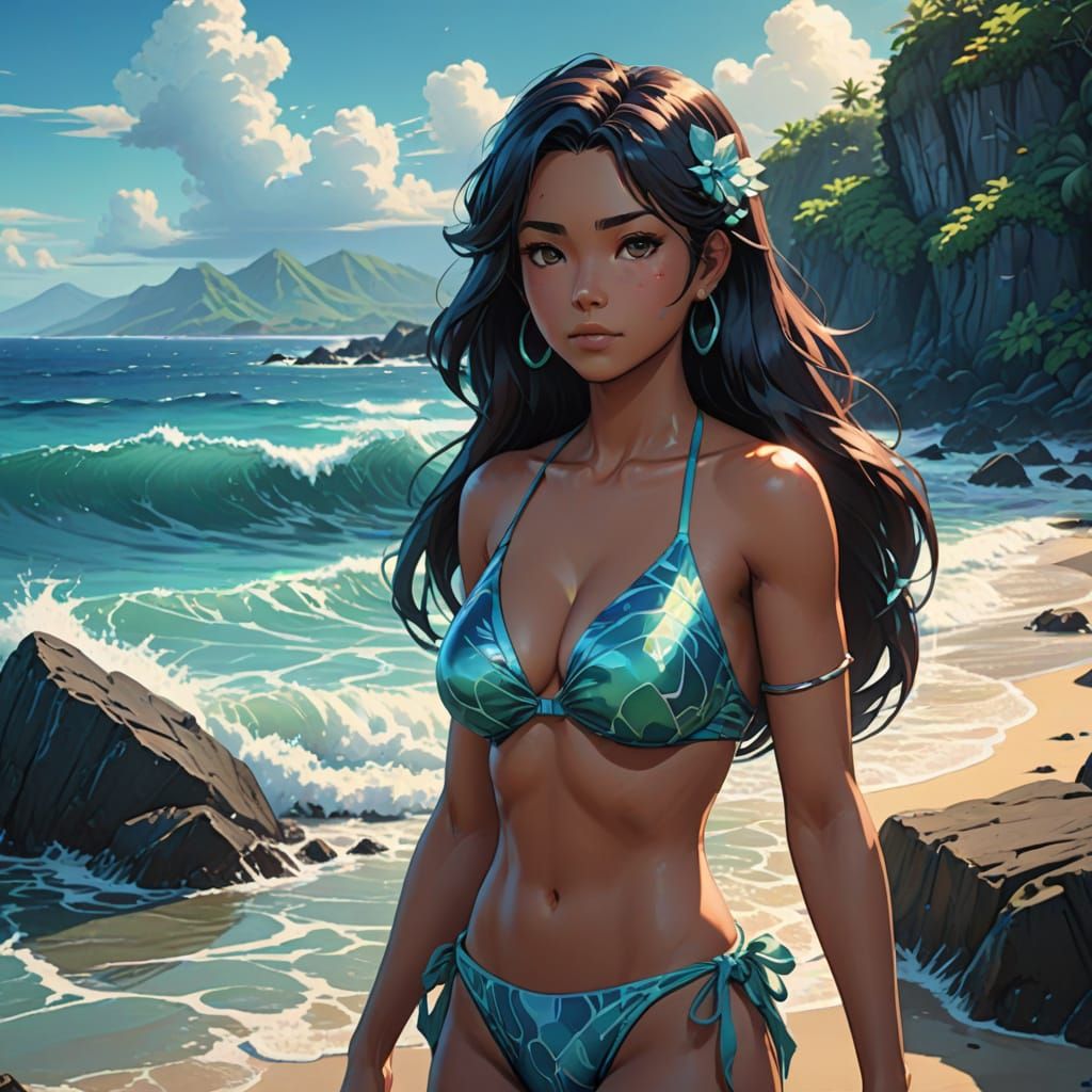 This image is a vibrant anime artwork featuring a beautiful Hawaiian woman wearing an aquamarine bikini, set against a stunning rocky shoreline with glowing ocean waves and warm sunlight.