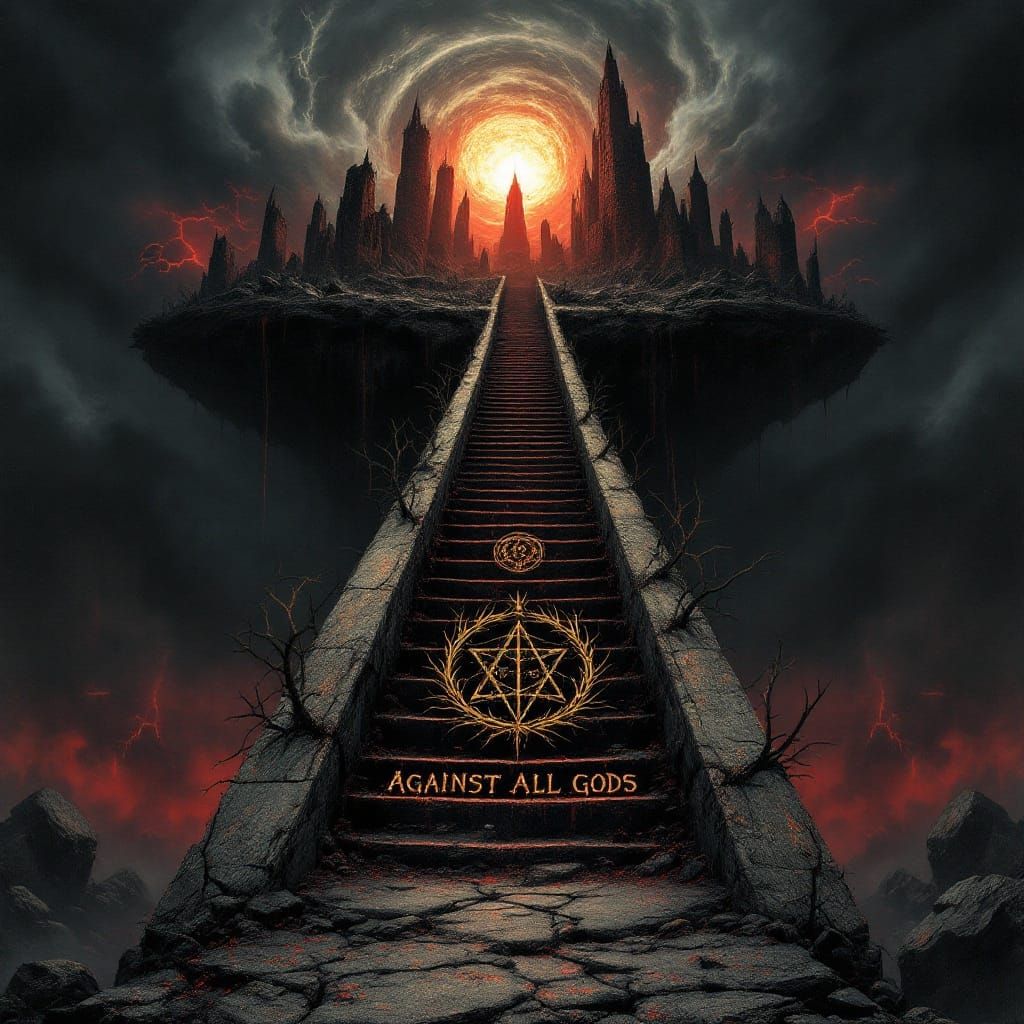This image depicts a haunting, dark fantasy scene with a ruined floating city in the background, surrounded by a swirling ash-filled void and crimson lightning storms. In the foreground, a chaotic ritualistic sigil is carved into ancient cracked stone, with the album title 'AGAINST ALL GODS' weathered be...