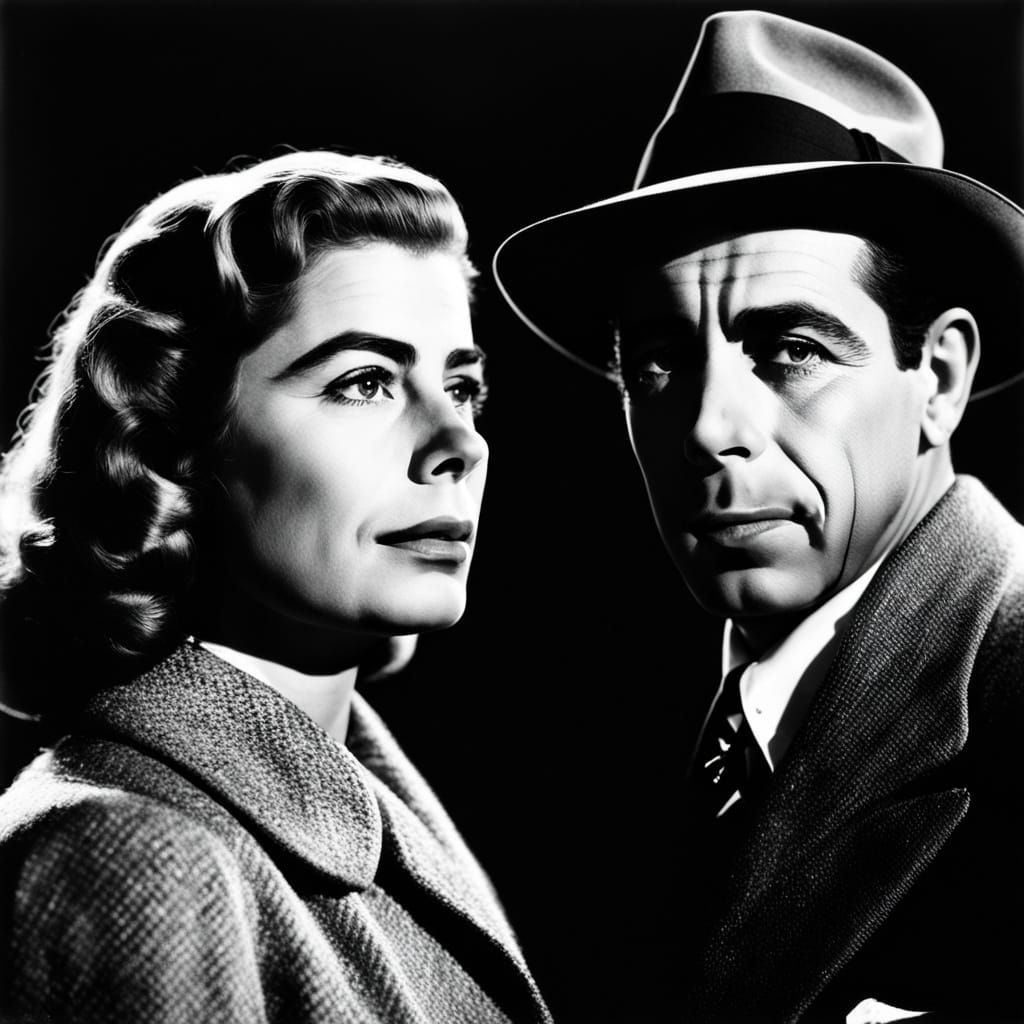 A vintage poster of a film noir scene featuring a man and woman standing close together. The image evokes classic Hollywood with its soft focus, warm lighting, and dramatic shadows.