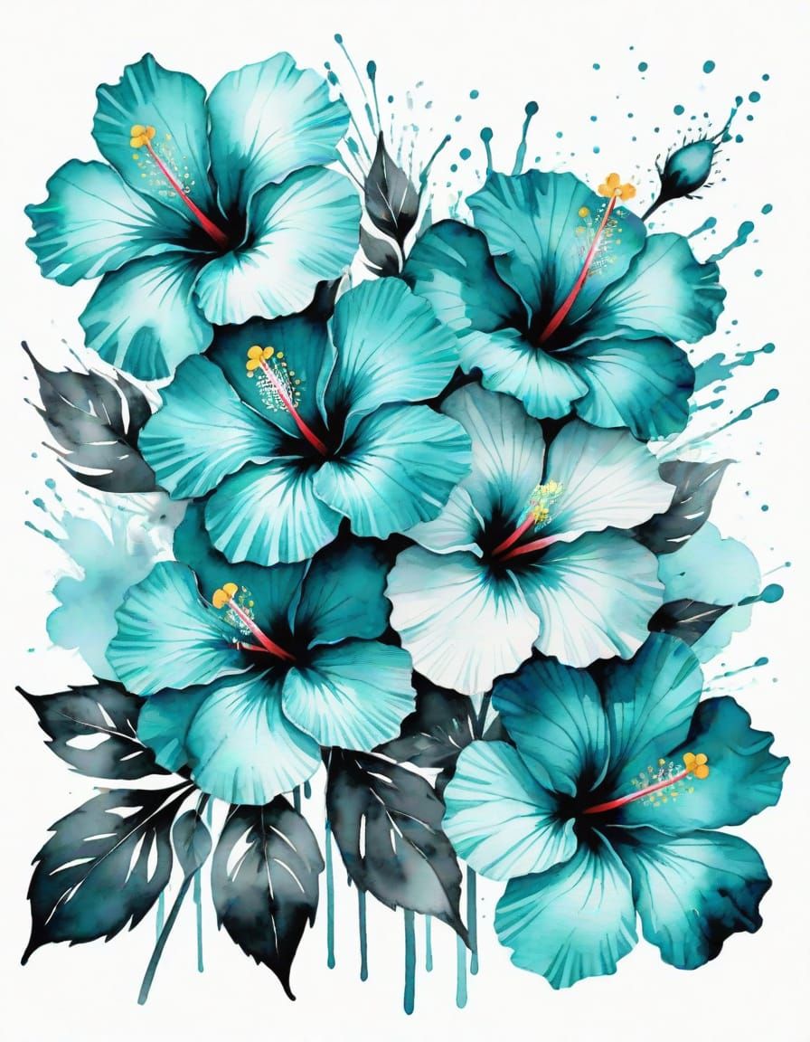 A vibrant watercolor splash art image featuring monochrome turquoise hibiscus flowers. The artwork captures the delicate details of the floral composition in a beautiful style.
