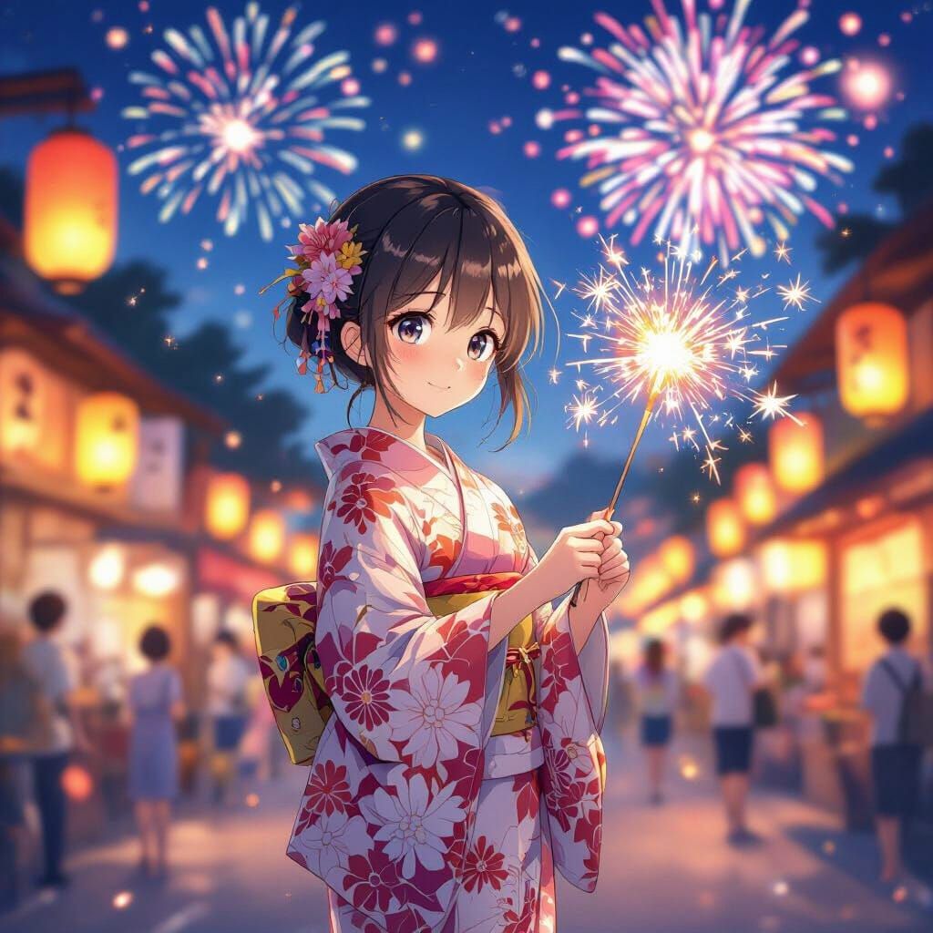 A vibrant anime image of a girl in a floral yukata holding a sparkler at a summer festival. Warm lanterns and bokeh lights illuminate the night sky filled with fireworks in a dreamy anime style.