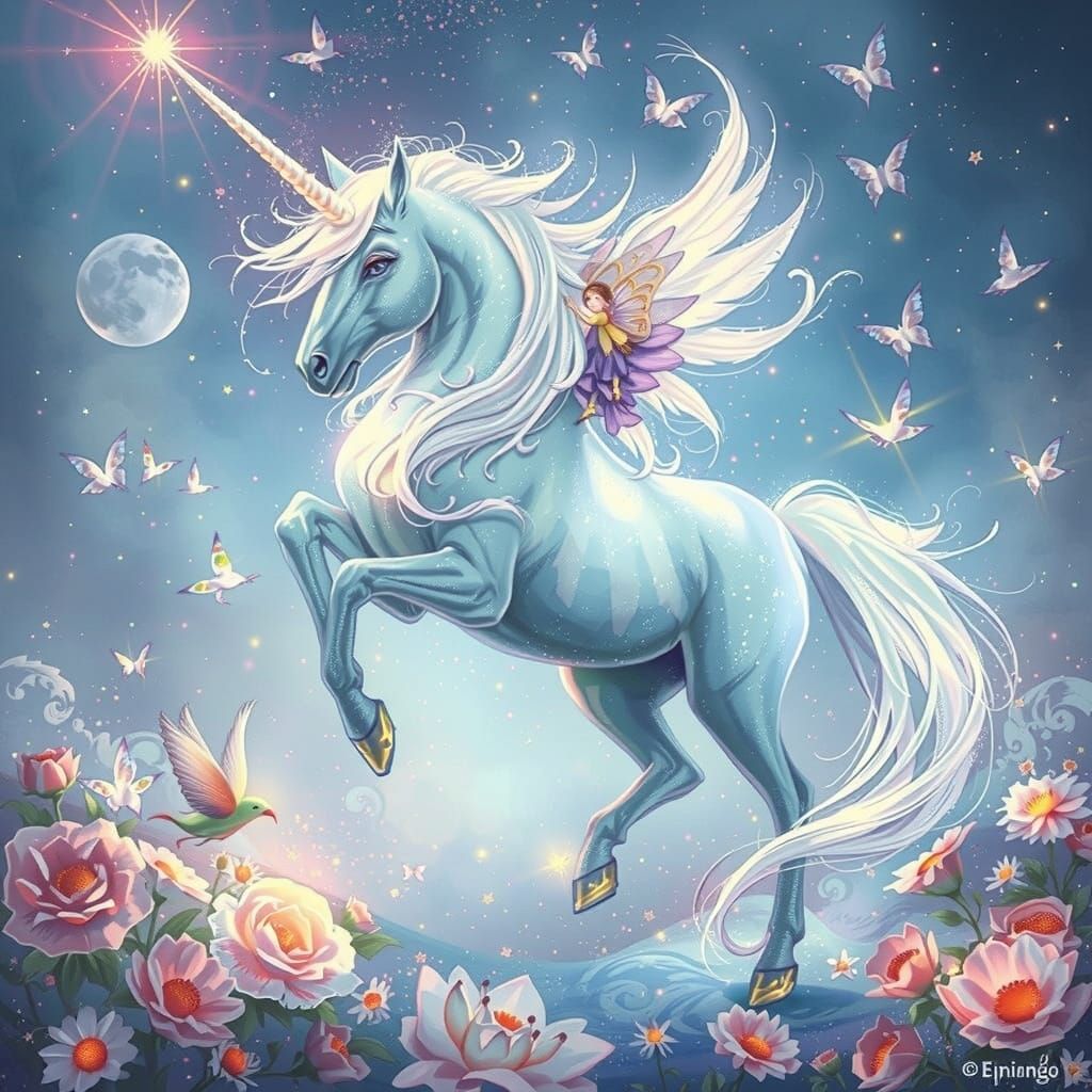 A vibrant image of a stardust unicorn in a magical realm. Fairies play among glowing flowers, rendered in a watercolor style with pastel shades to create an ethereal atmosphere.