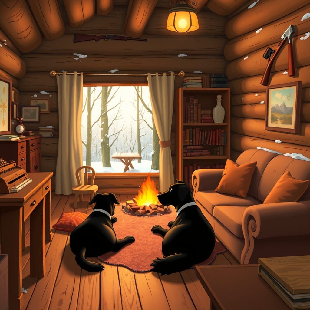 This image shows the interior of a snug log cabin nestled in a snowy forest. Two large black dogs relax by a lit fireplace in an animation style similar to vintage Disney.