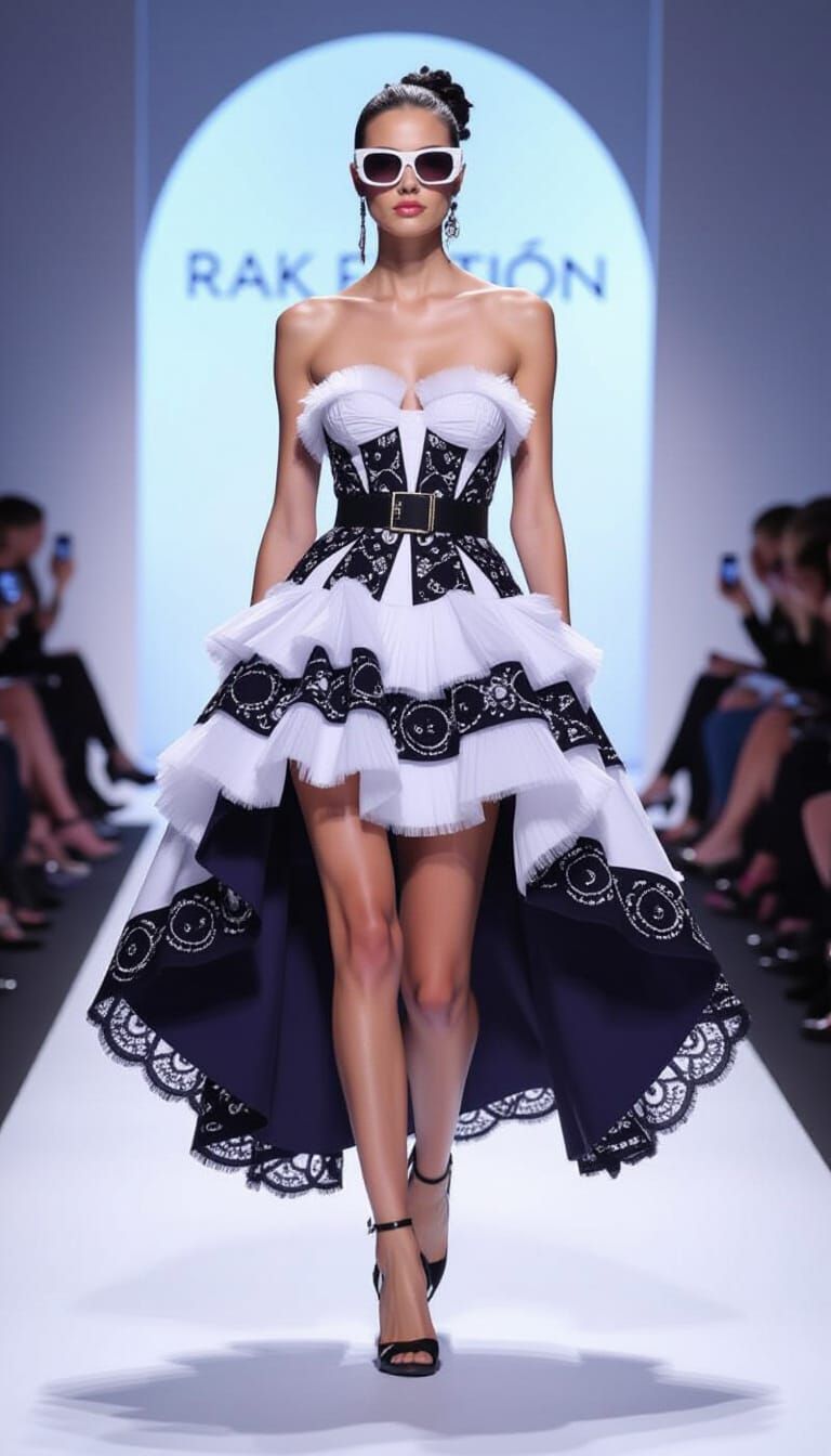 This image showcases a high-fashion scene with elements of augmented reality. The models exhibit doll-like makeup, intricate fabric structures, and unique high-heeled sneakers, blending virtual and physical styles.