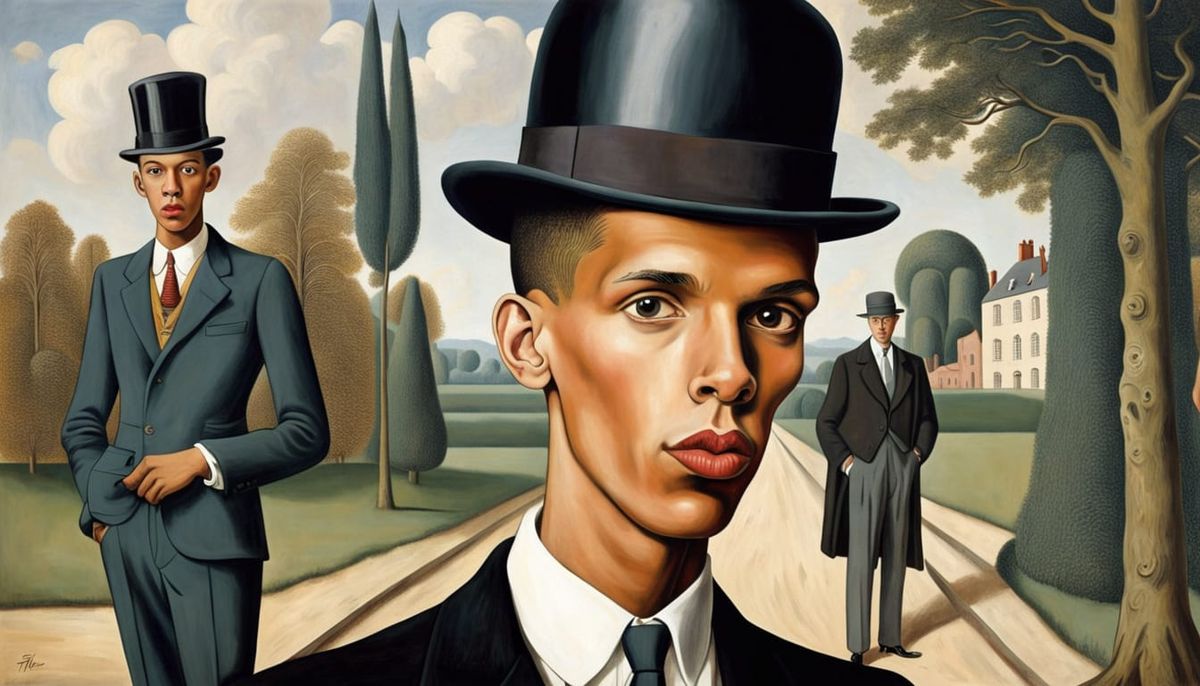 This image depicts a Belgian man wearing a bowler hat and suit, rendered in the ligne claire comic art style inspired by surrealist painters.