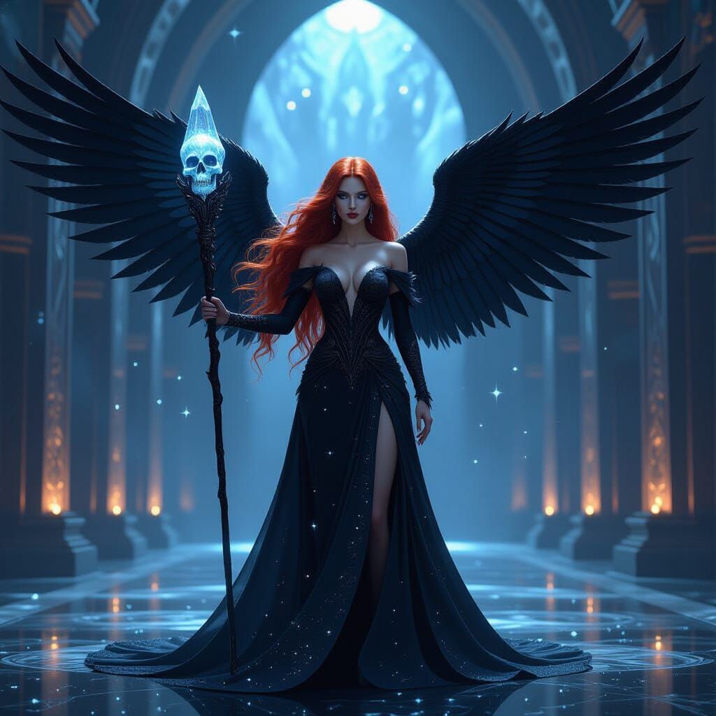 A stunning image of a goddess with red hair and feathered wings in a hall of obsidian. She wears a gown of shadows and holds a crystal skull staff, rendered with mystical details in a digital art style.