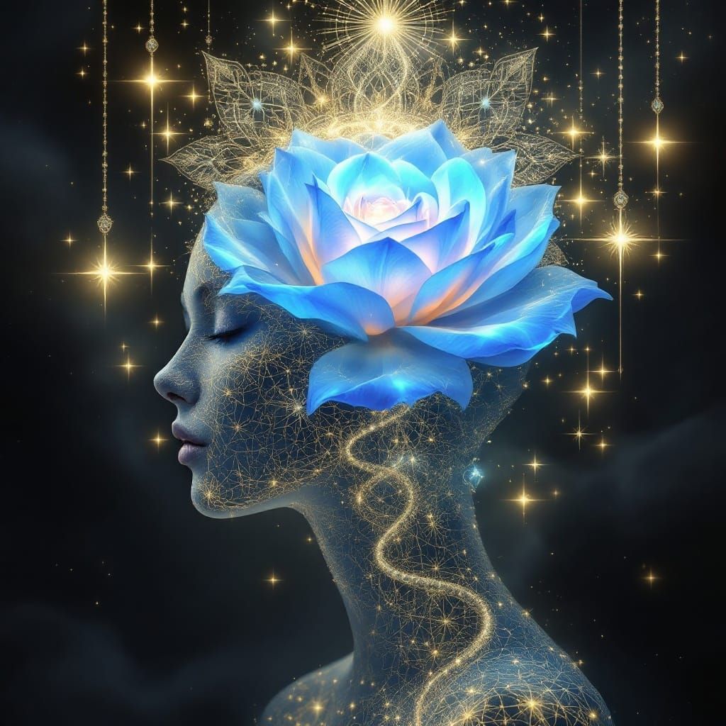 This image shows a celestial being adorned with golden mandala patterns, amidst a halo of stars and jewels. A blue rose glows ethereally, as light dances around it. This digital art evokes a mystical ambiance.
