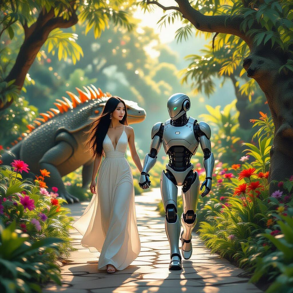 This digital matte painting shows a woman and robot walking with a Komodo dragon in a lush garden. Golden hour light creates a warm, cinematic atmosphere with rich colors.
