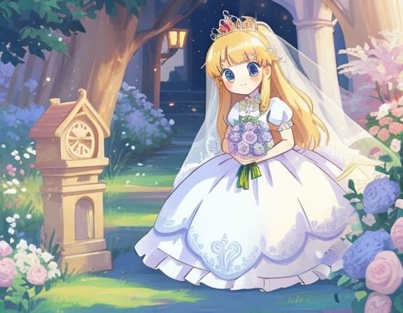 This image showcases a sweet anime-inspired princess bride in her elegant wedding dress, exuding innocence and charm.