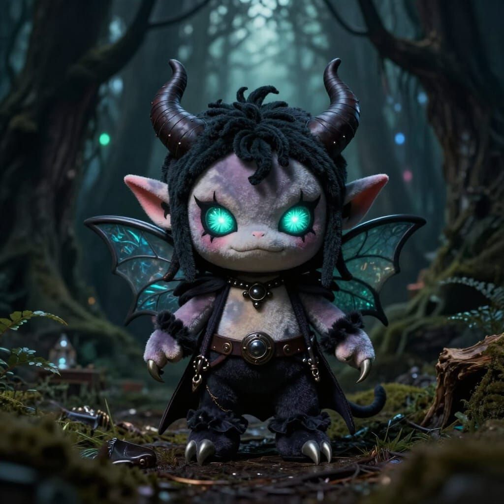 This image shows a charming yet fierce chibi demon fairy brawler in a dark forest. It features glowing eyes and sharp claws, rendered in a dramatic, detailed dark fantasy style with striking light and shadow.