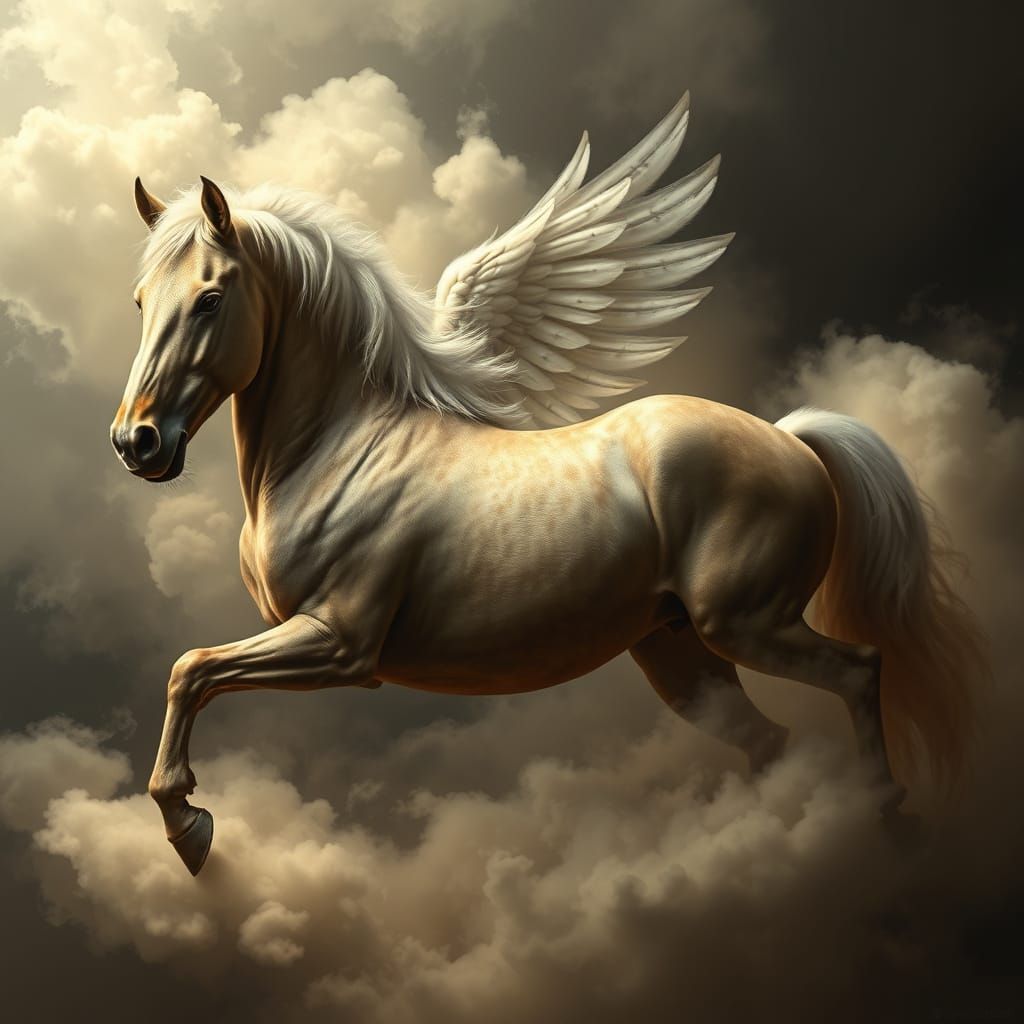 A hyperrealistic image of a magnificent horse amidst fluffy white clouds shaped like animals. The artwork employs chiaroscuro techniques, soft textures, and warm lighting to create a dreamy scene.
