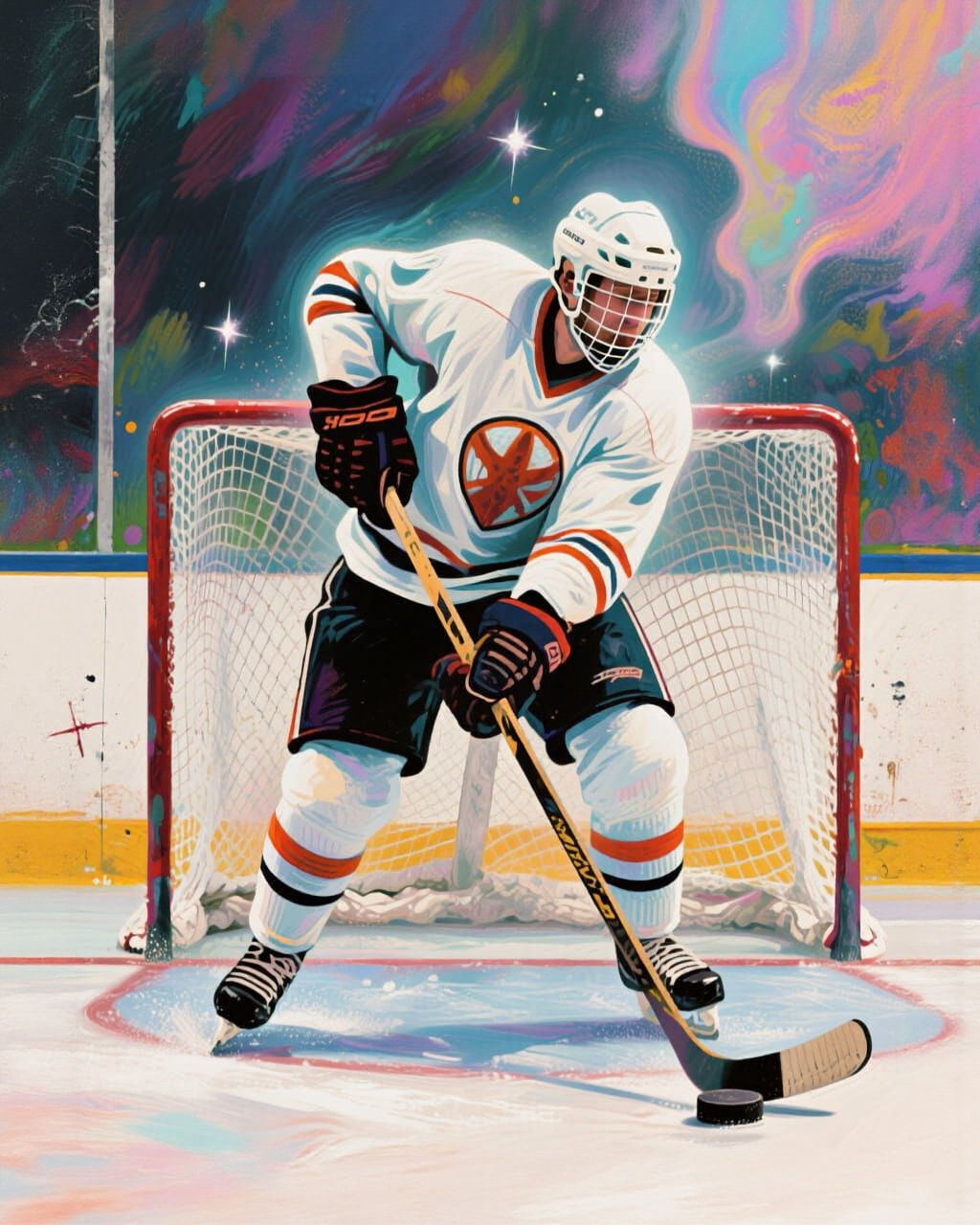 This hyper-detailed image captures a hockey player striking a puck into a goal, presented in a vibrant, ethereal sports poster style with dreamy surrealism.