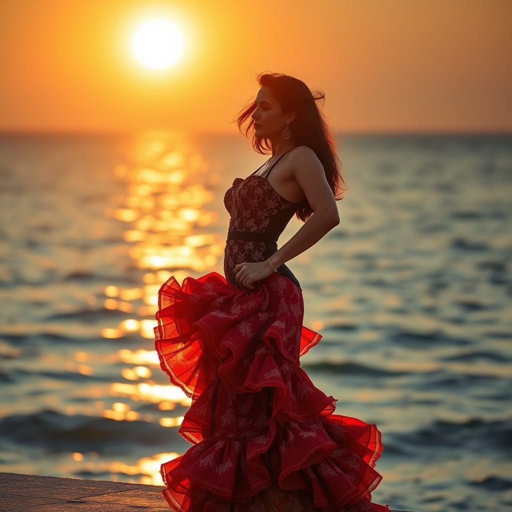 This image shows a beautiful Spanish woman posing on a beach with a traditional flamenco dress. The artwork evokes surrealist and impressionist painting styles.