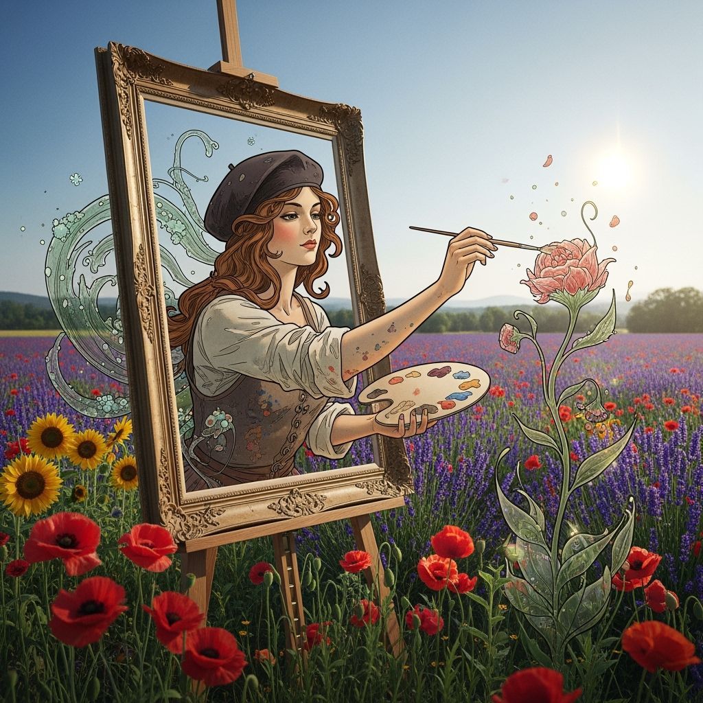 This image shows a gorgeous artist stepping out of a vintage picture frame into a field of flowers. The style is reminiscent of Art Nouveau with ethereal, fantastical elements.