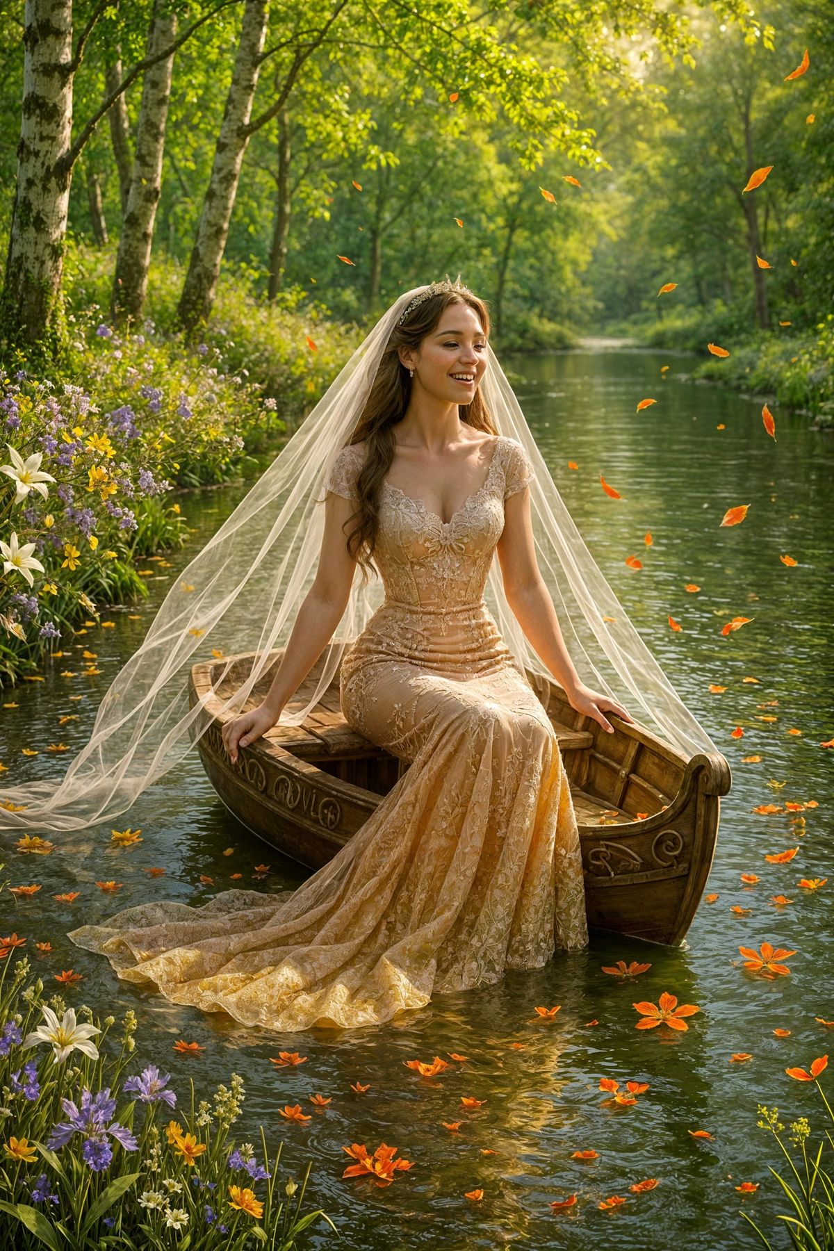 A striking picture of a bride seated on a small boat in a sun-dappled, enchanted meadow with a river. She wears a mermaid-style wedding dress in soft pink and warm yellow tones, in photorealistic digital art.