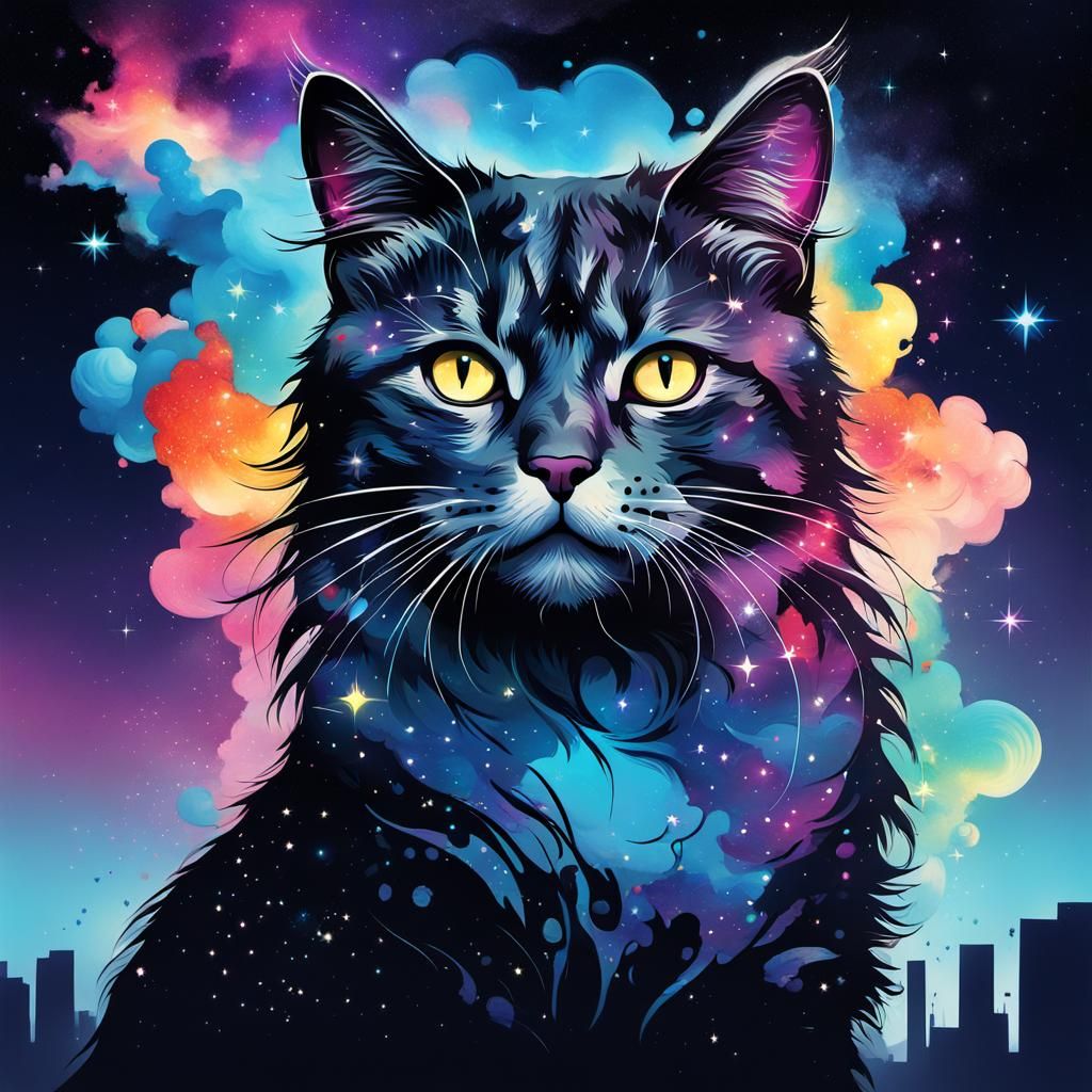 A striking picture of a cat silhouette set against a double exposure of a celestial night sky. The image is rendered as colorful, high contrast graffiti street art.