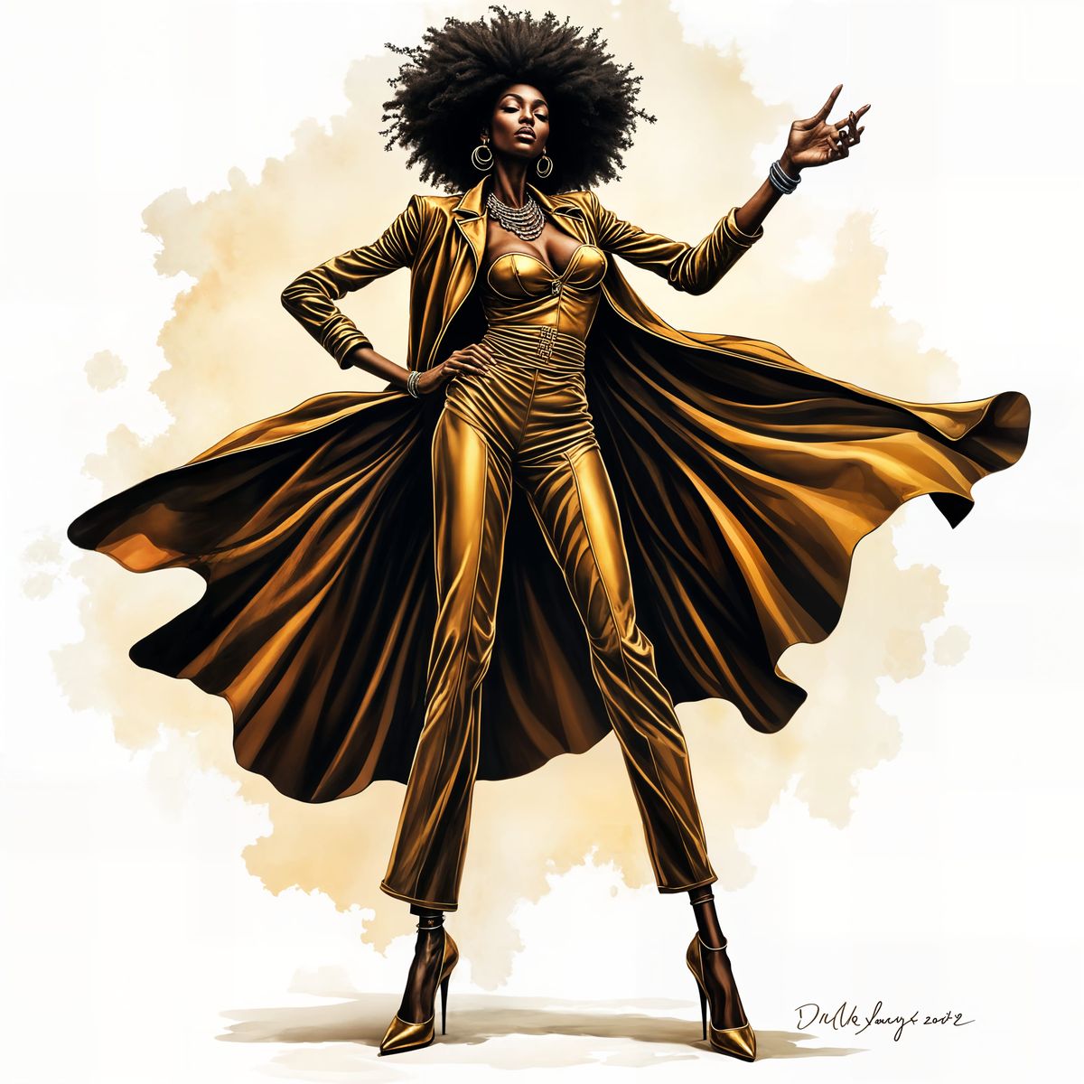 This illustration features a beautiful, dark-skinned Black woman adorned in a striking avant-garde outfit, showcasing high fashion and unique design.