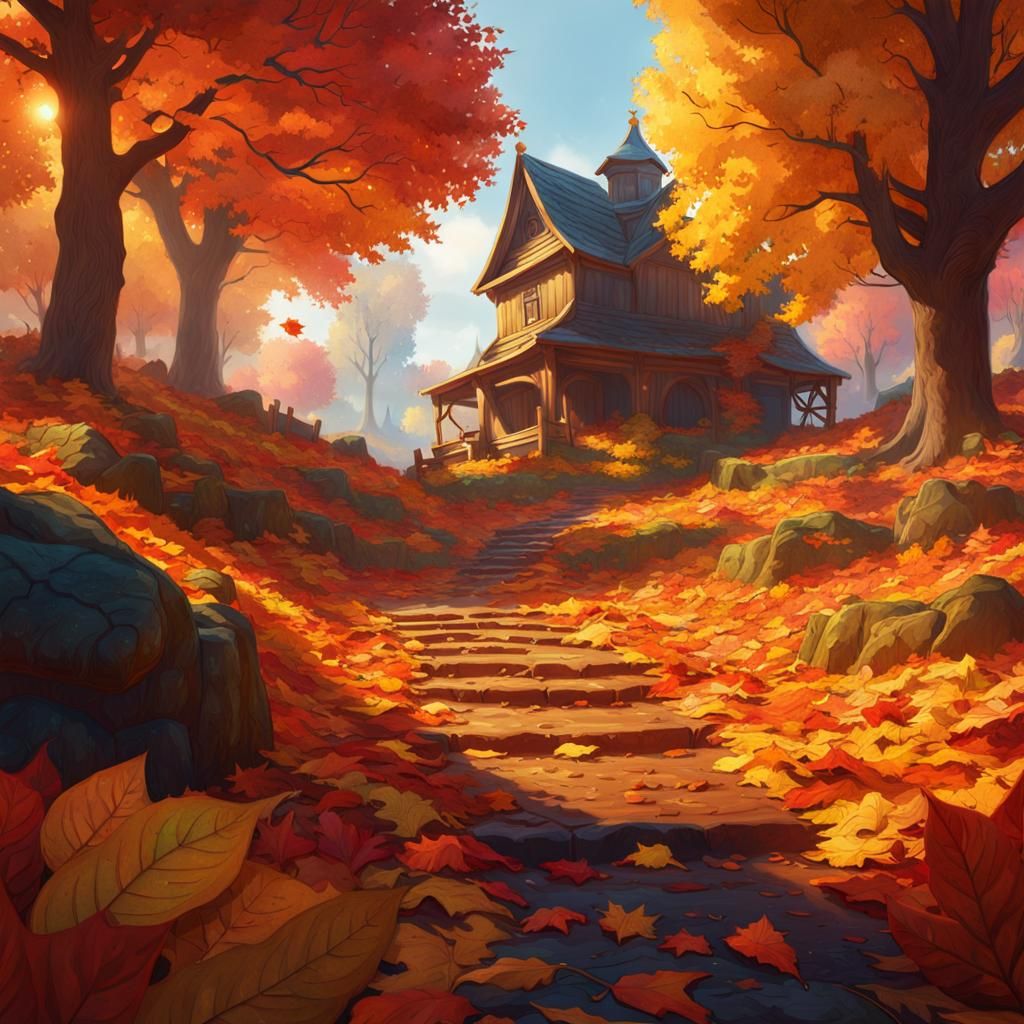 This image shows a detailed matte painting of autumn leaves. The artwork uses deep color and intricate detail to create a fantastical scene with complementary colors.