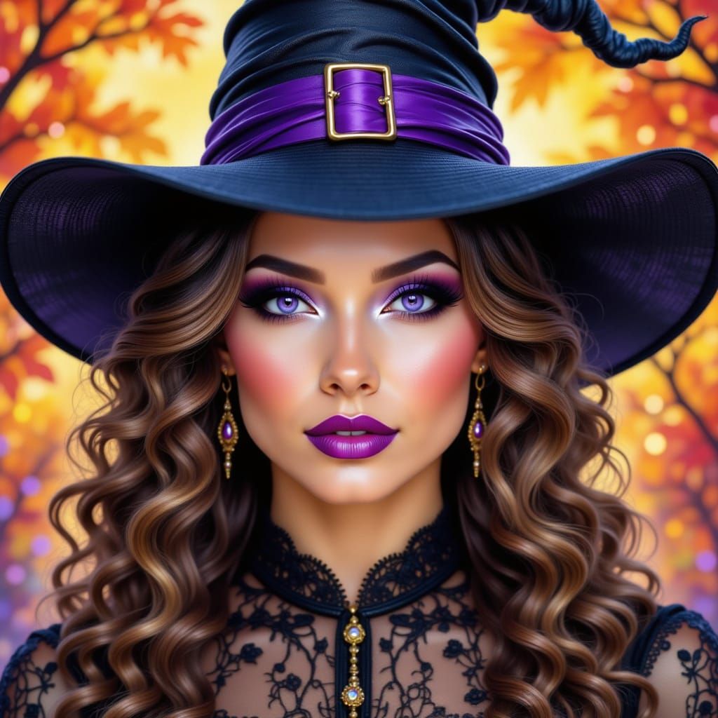A macro closeup portrait of a person wearing a black and purple witch hat, set against a vibrant autumn watercolor background. The image features a detailed, artistic style.