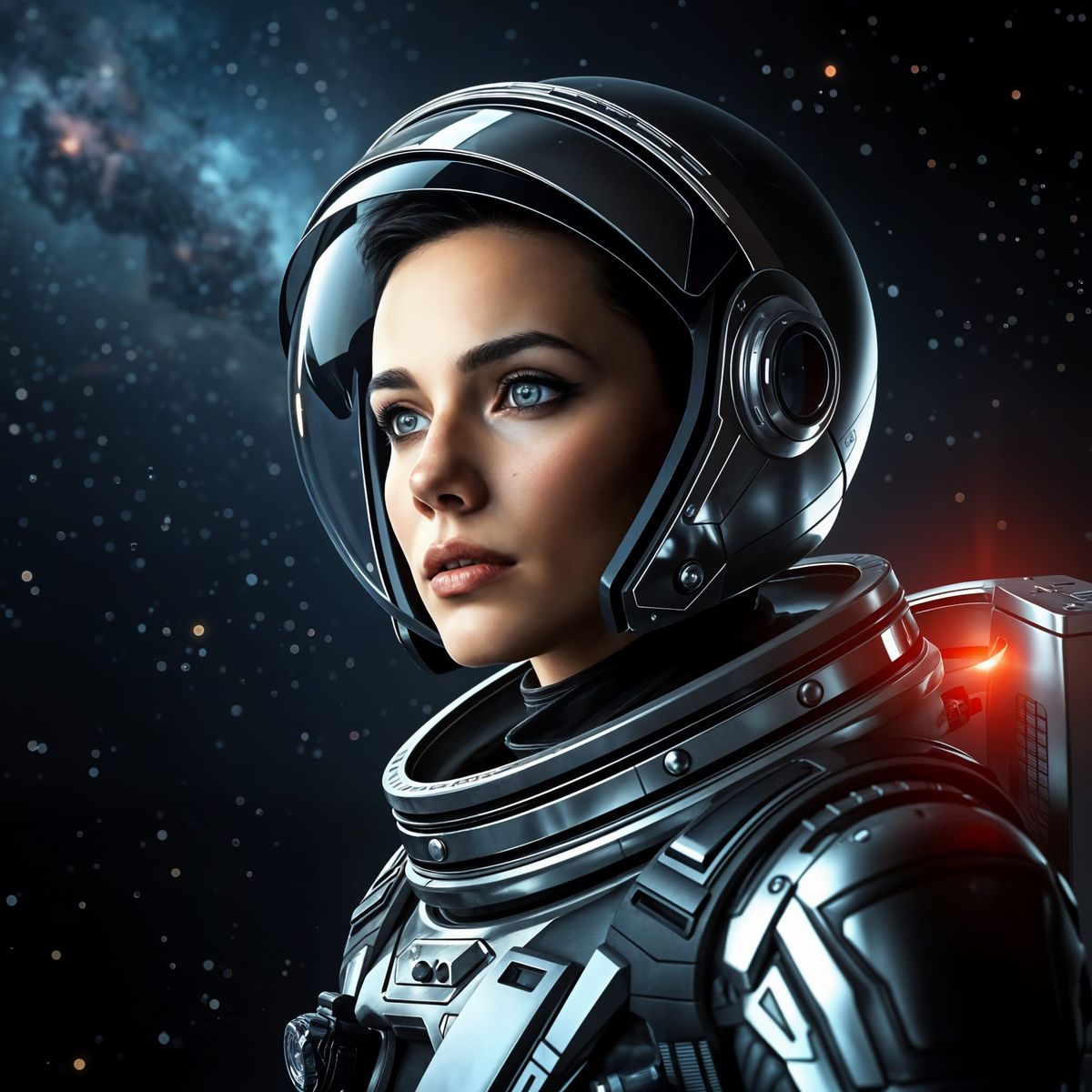 This image shows a head and shoulders portrait of a female space traveler. The artwork features dynamic lighting, intricate details, and a vibrant color palette, rendered as splash art.